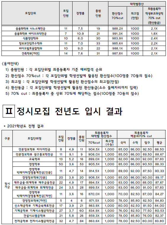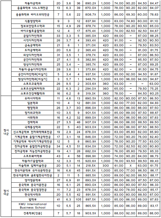 국민대학교 2021학년도 입시결과-수시등급. 정시 커트라인