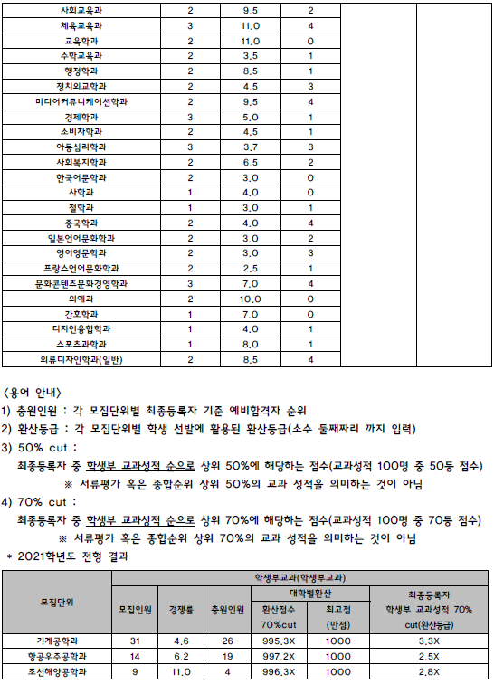 인하대학교 2021학년도 입시결과-수시등급. 정시 커트라인