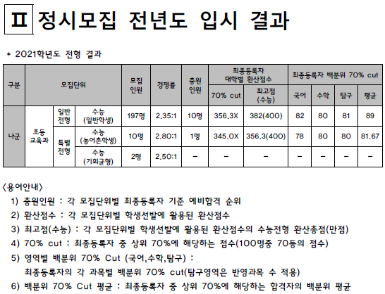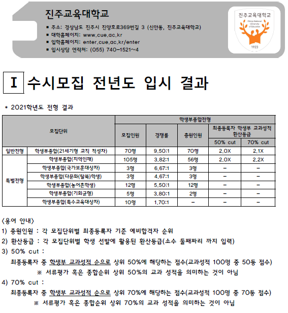 진주교육대학교(진주교대) 2021학년도 입시결과-수시등급. 정시 커트라인