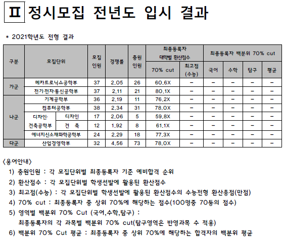 한국기술교육대학교 2021학년도 입시결과-수시등급. 정시 커트라인