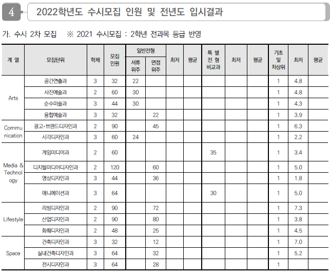 계원예술대학교 2022 수시전형 모집요강 및 전년도 수시 입시결과(수시등급)