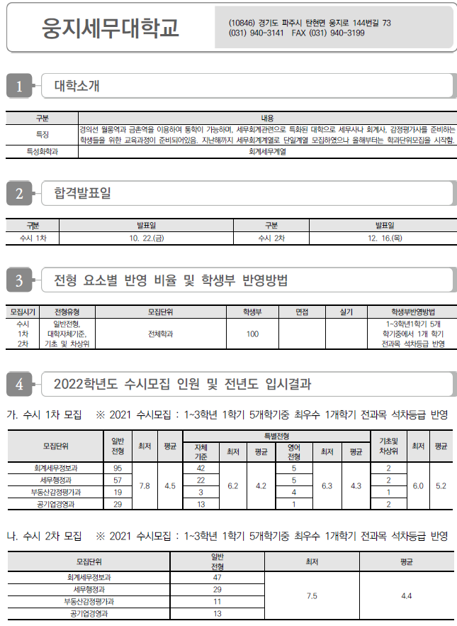 웅지세무대학교 2022 수시전형 모집요강 및 전년도 수시 입시결과(수시등급)