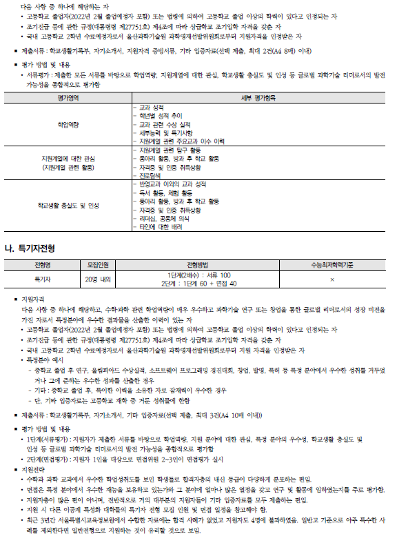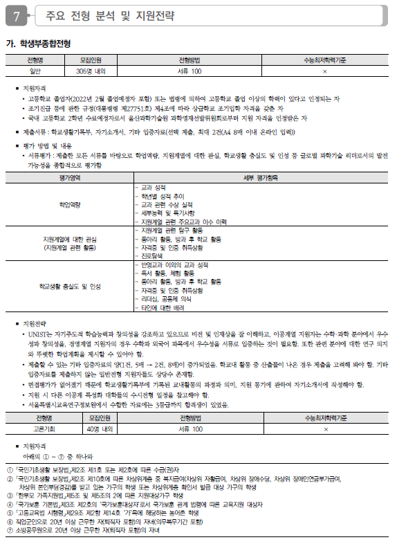 울산과학기술원(유니스트. UNIST) 2022학년도 수시전형 방법, 모집요강 및 전년도 수시 입시결과(수시등급)