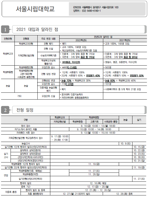 서울시립대학교 2022학년도 수시전형 방법, 모집요강 및 전년도 수시 입시결과(수시등급)
