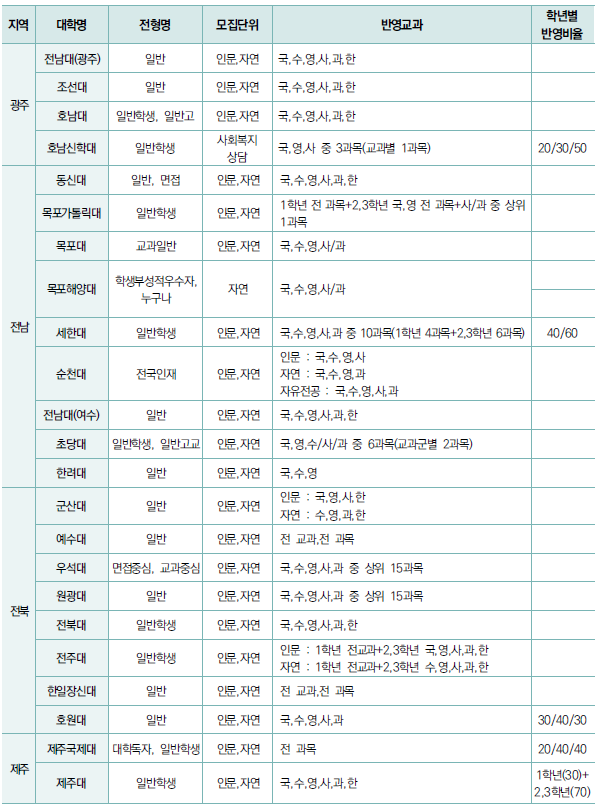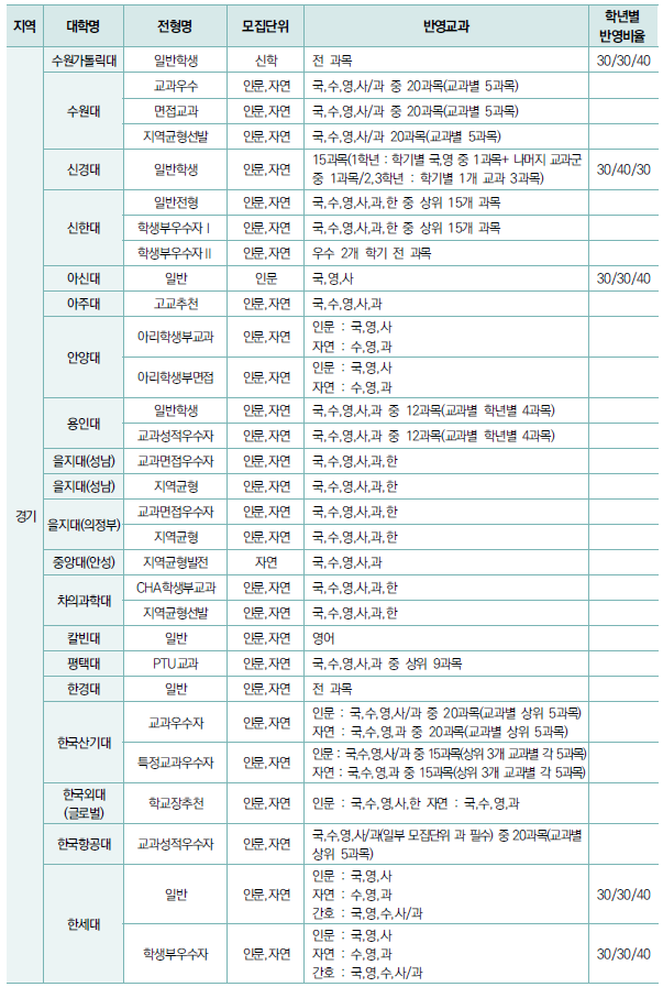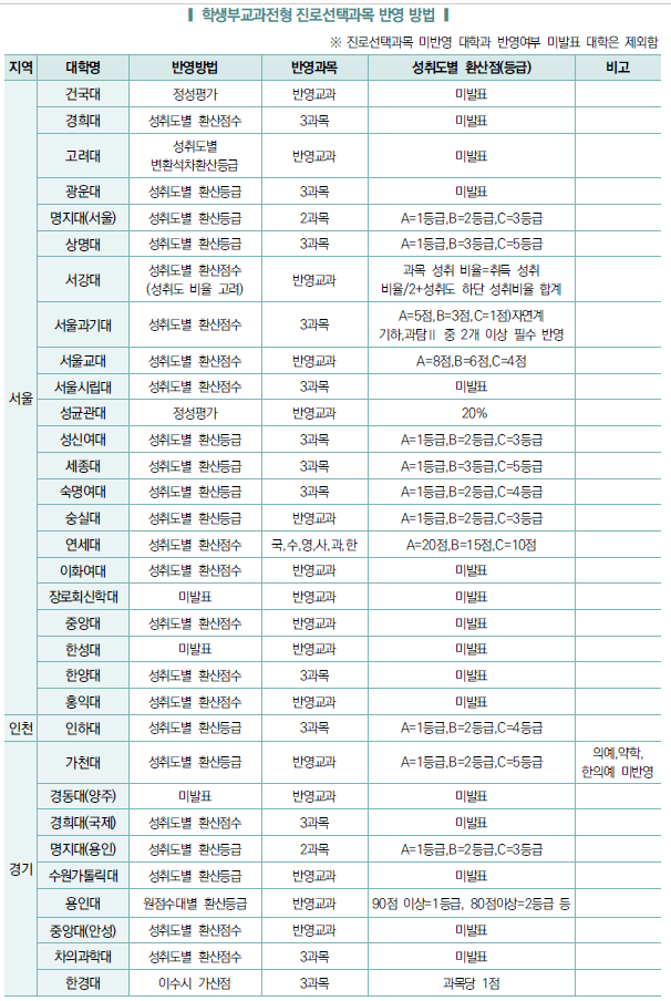 - 교과 성적 반영 방법은 대학마다 차이가 있어 대학별 반영 비율, 반영 교과, 과목 개수를 파악.