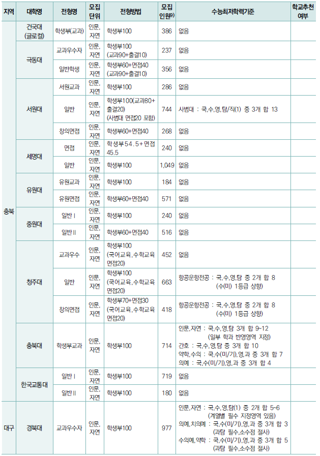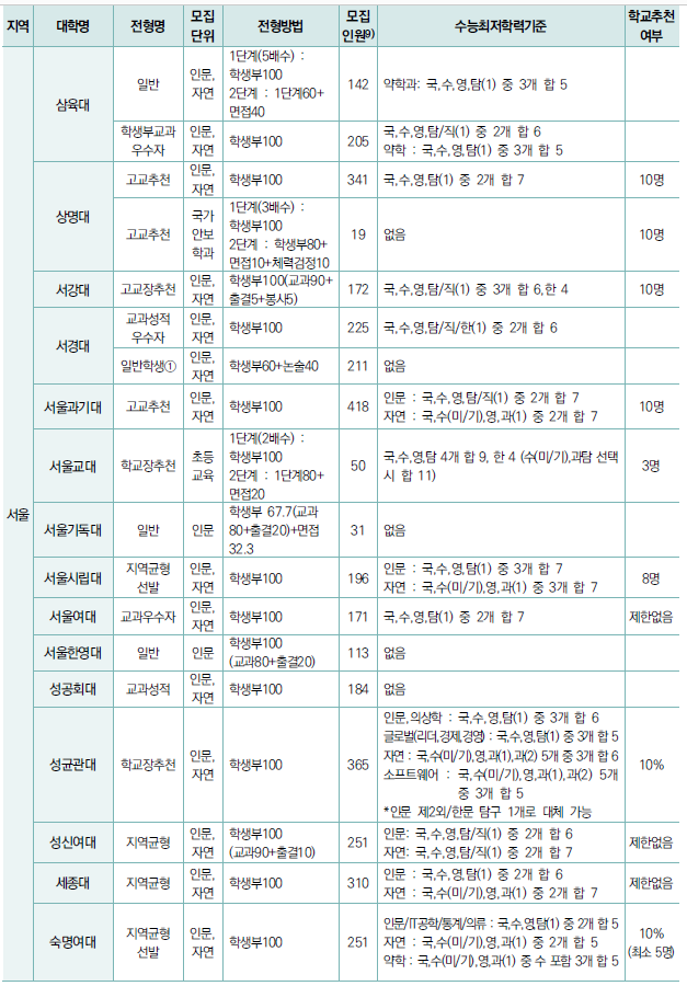 (1) 학생부 100%(비교과 포함) 전형 - 대부분 수능 최저 적용, 교과 성적의 합격선이 높음, 비교과의 경우 대부분 출결이나 봉사 시간을 반영