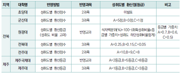 - 대학별 환산등급 반영 점수 사용. 환산 점수 산출은 대학마다 다르고 진로선택과목 반영, 수능 최저 적용 등 대학마다 조건이 다양하게 적용.