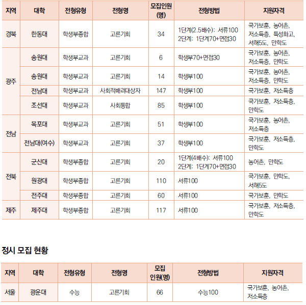 2023학년도 고른기회 특별전형 - 지역인재, 통합특별전형(국가보훈,농어촌,저소득,장애인,만학도,특성화고)