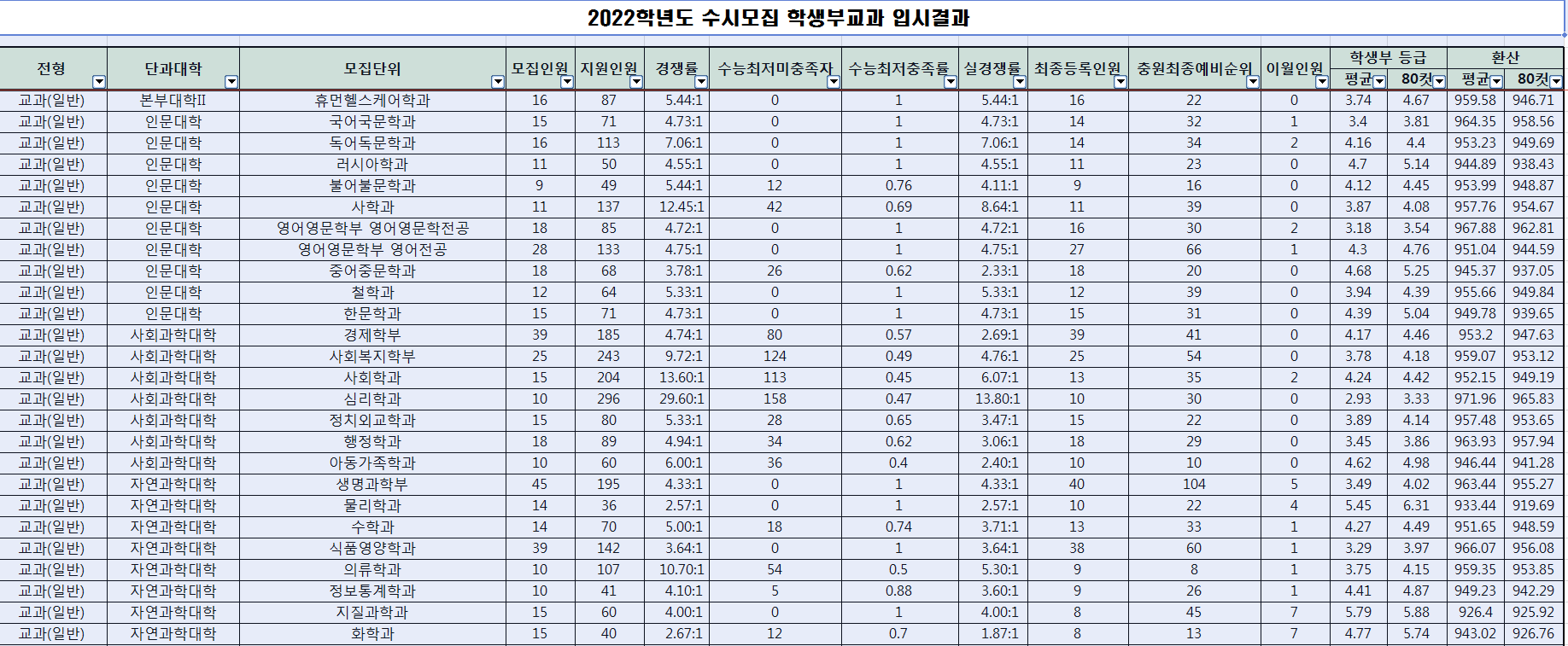2022학년도 경상국립대학교 수시 입시결과(커트라인)