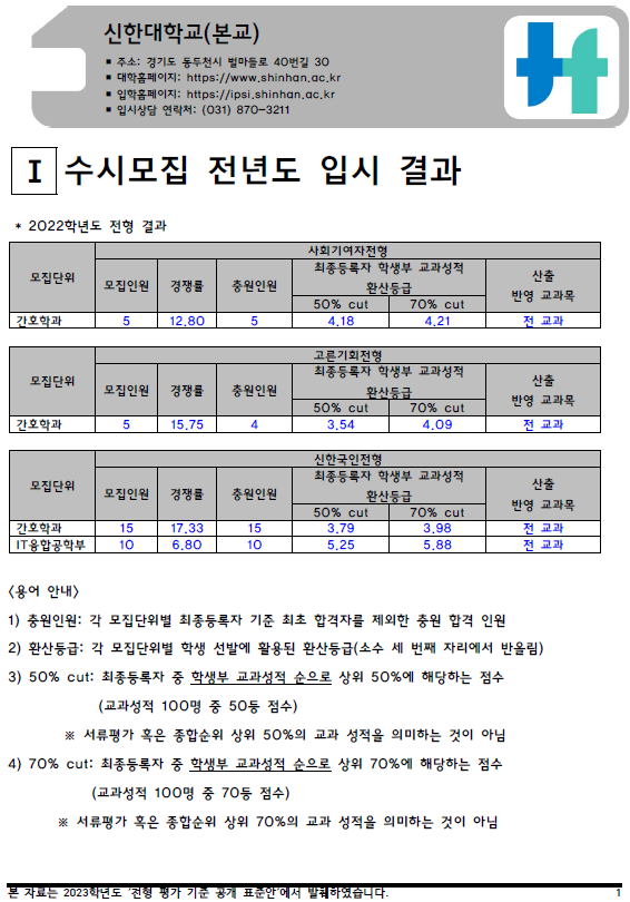 2022학년도 신한대(본교), 신한대(제2캠퍼스), 안동대 - 수시, 정시 입시결과 (커트라인)